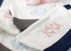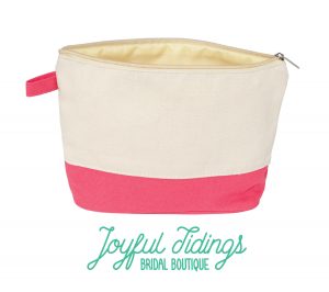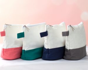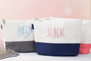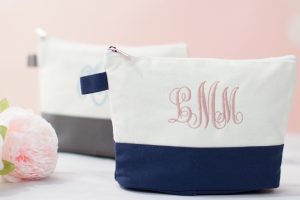 Our high quality canvas cosmetic bags are made with 70% cotton, 30% polyester, and feature a full length tone-on-tone zipper to secure bag contents, contrasting bottom trim and loop handle, piping along the bottom for added stability, and full polyester lining. The bag dimensions are as follows: Length: 10″, Height: 6″, Width: 3″. We think this is a great size because it is not too big (there are totes for that!) nor too small such that the embroidery is hard too see; the size also makes it versatile enough to be used as both a cosmetic bag and a clutch. We offer these both with and without embroidery.
