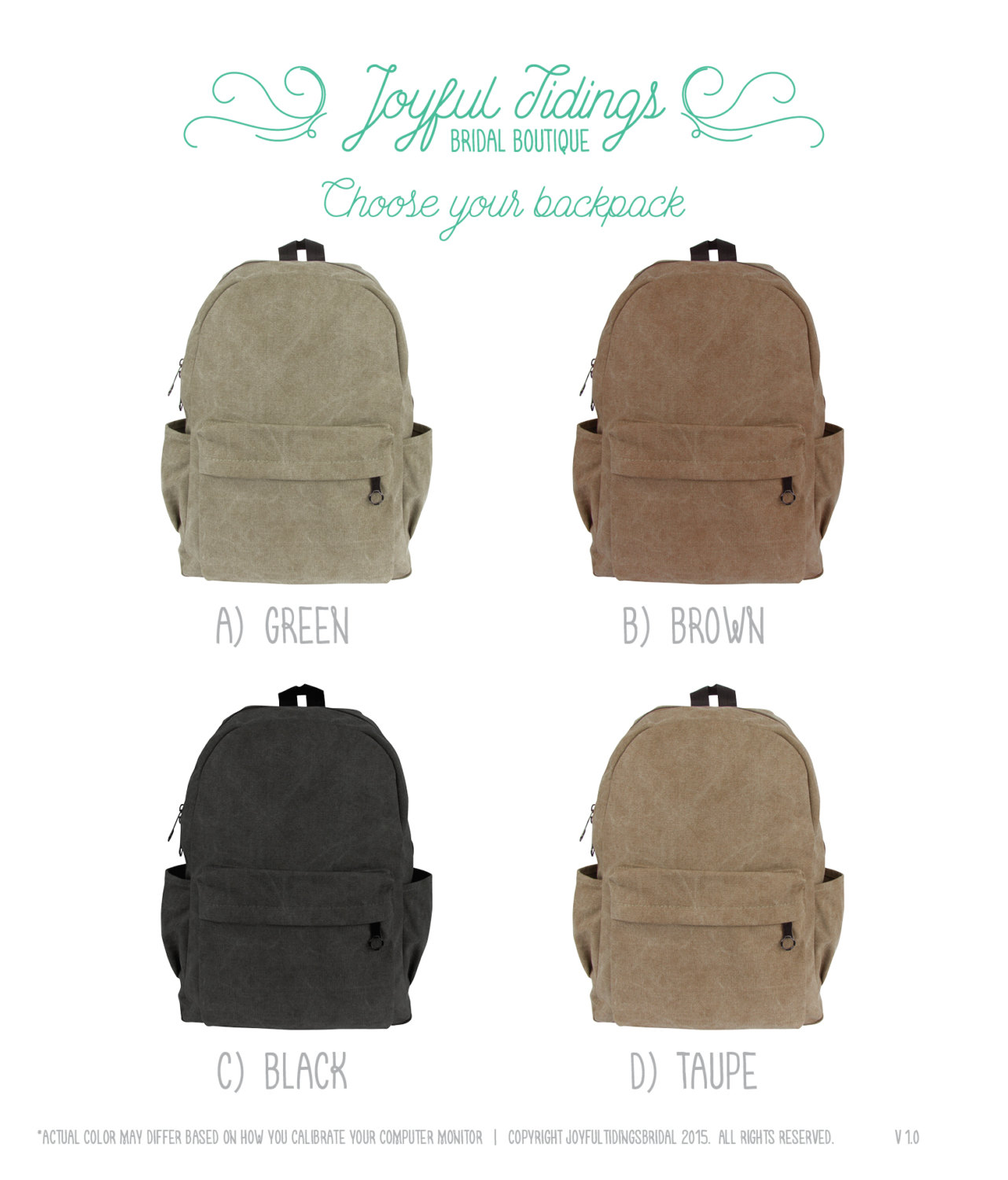 This personalized rugged canvas backpack is the perfect gift for your groomsmen! Made with heavyweight cotton canvas, these bags are both practical and durable. The interior is fully polyester lined with a handy pocket for organization. Additional features include an outside front zipper pocket, two side pockets, and black trim. Personalize them to create a special, unique gift!